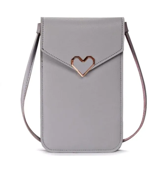 Krásná malá kabelka na mobil může zaujmout každou ženu, která používá chytrý telefon. Velmi snadno lze nosit na rameni nebo v ruce, protože má dlouhý nastavitelný popruh zavázaný na uzel. Doplňkem kabelky je zdobené kovové srdce ve zlaté barvě.