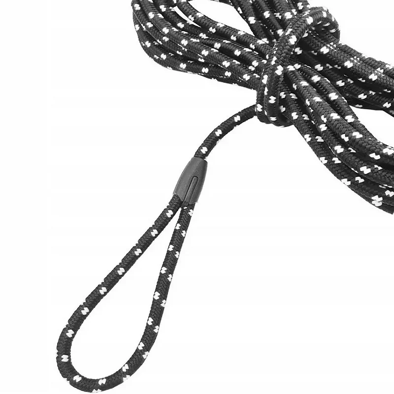 Silné reflexní cvičné lano pro psy – 10m. Odolné polypropylenové lano o průměru 1 cm s pevností až 2000 kg, vhodné pro střední a velké psy. 2x kovová karabina s otáčením 360°. Snadná údržba, možnost praní. Barva: černá, červená nebo modrá.