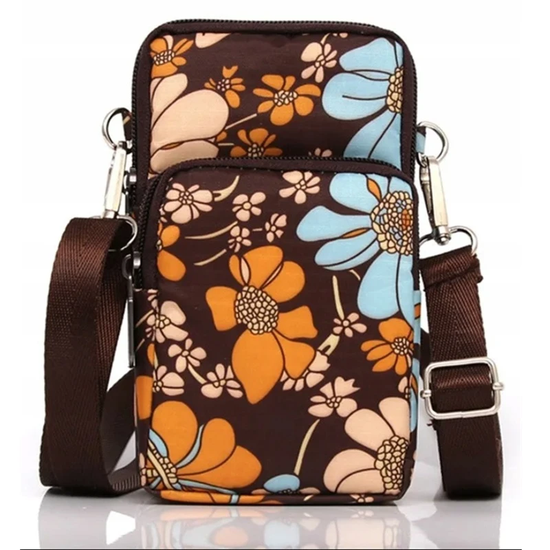 Dámská taštička na telefon a doklady přes rameno KVĚTINA RO78 – hnědá s květinami