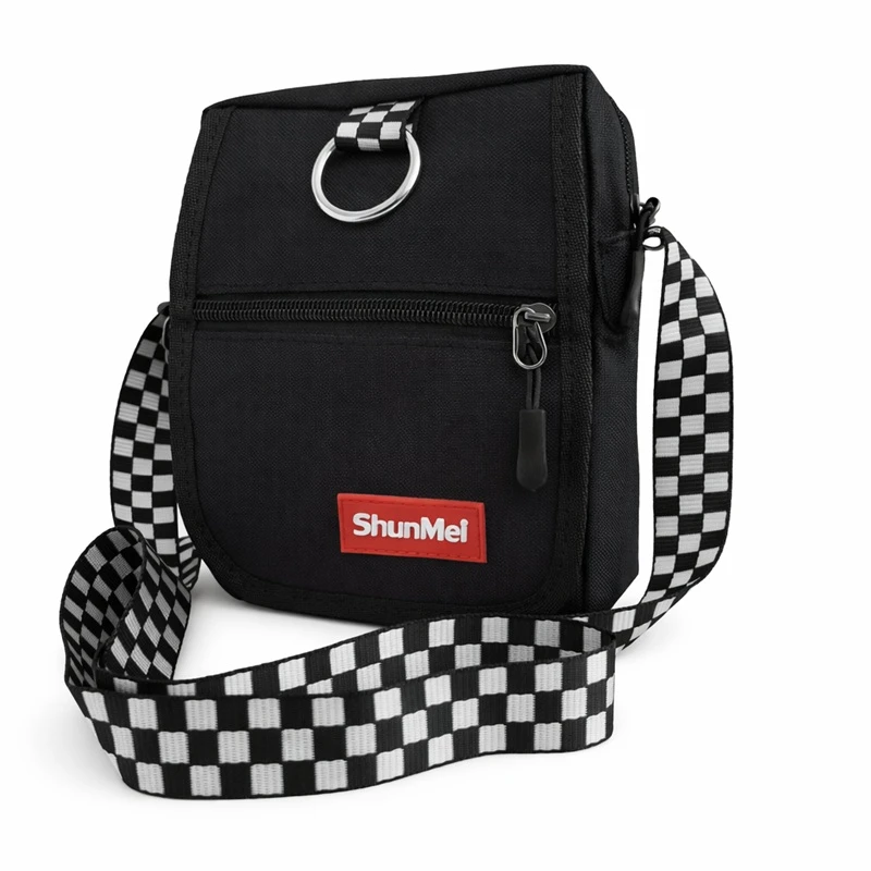 Na první pohled zaujme kombinace černého těla taštičky a výrazného černo-bílého popruhu se šachovnicovým vzorem. Přední stranu doplňuje kovový kroužek a červený štítek s logem ShunMei, které podtrhují moderní, lehce sportovní vzhled.